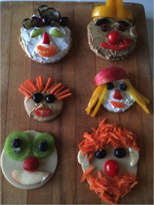 Food play is really good for introducing kids to new foods, or making things they usually don’t like seem more appealing. Make our Funny Faces – great for lunch, supper or snacks. Even toddlers can have fun doing this.