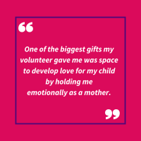 My volunteer helped me feel like a human again which my post-natal depression and traumatic birth took away. I valued Adele’s nature, which felt so aligned and matched to my own, thanks to my Coordinator.